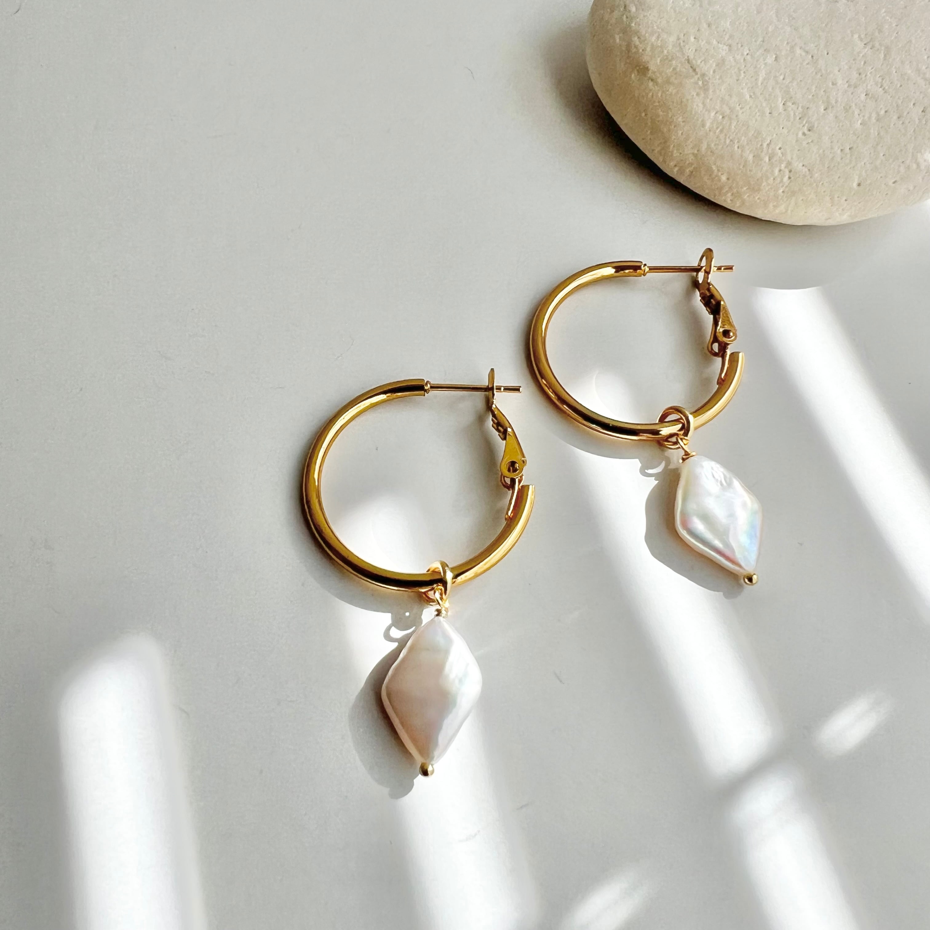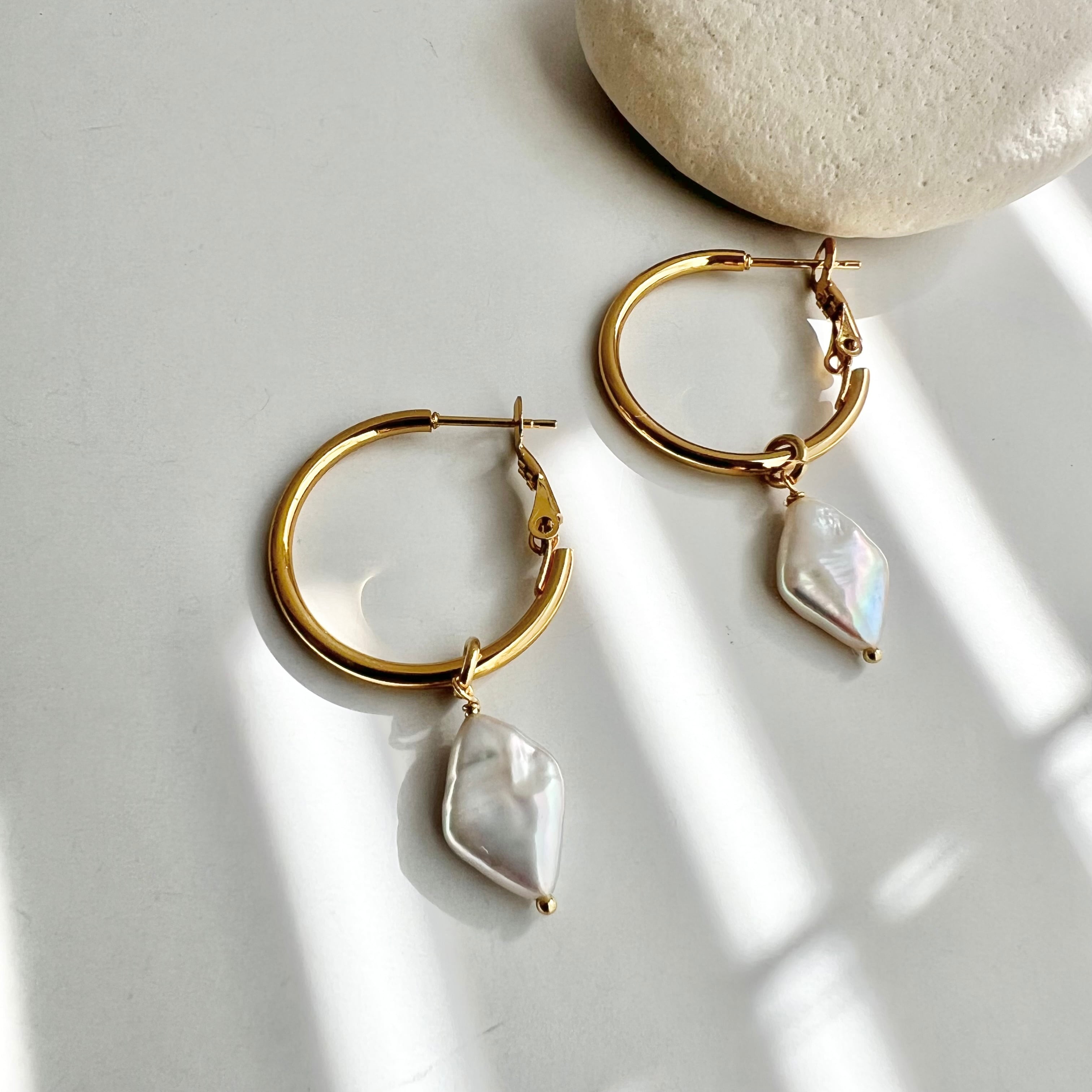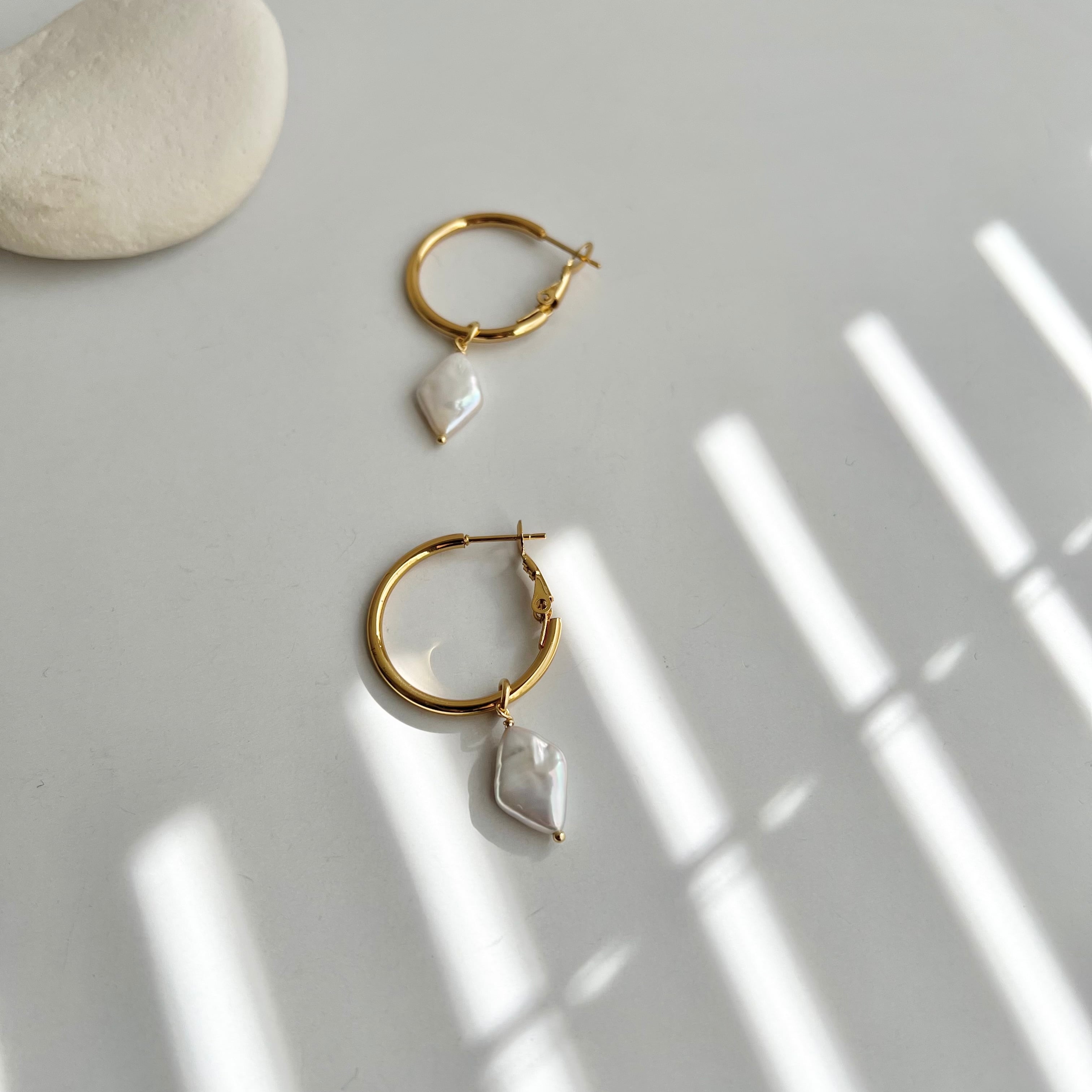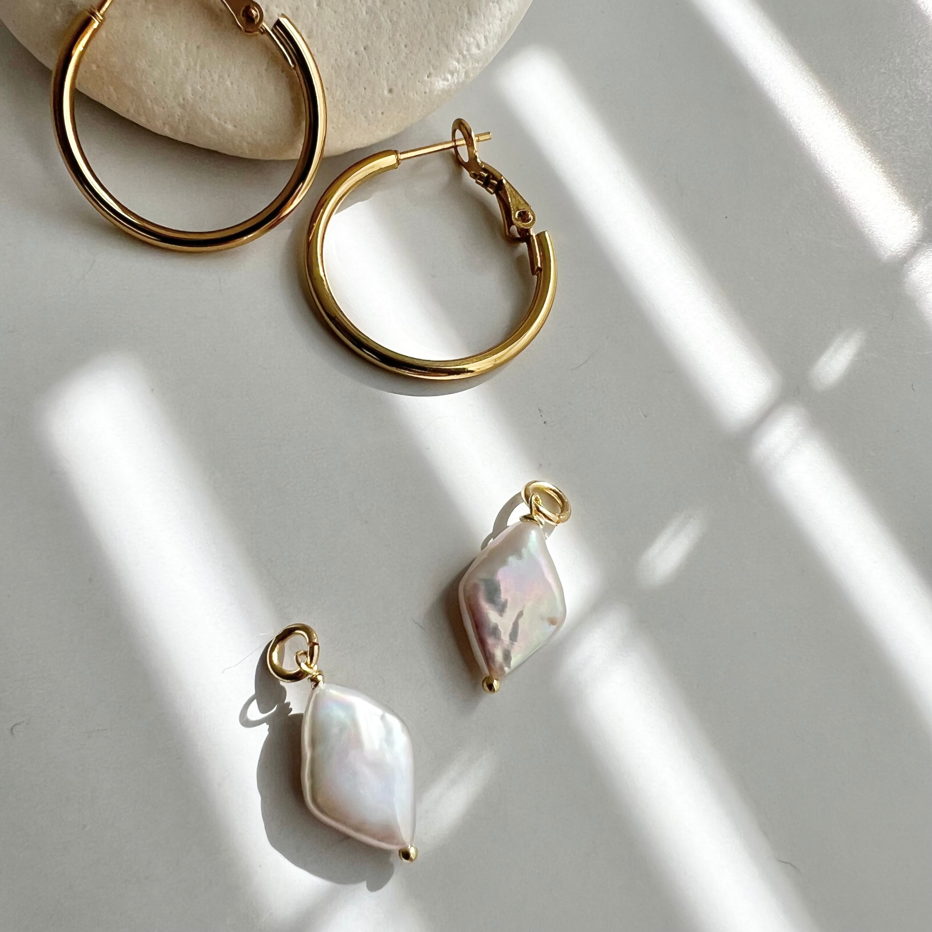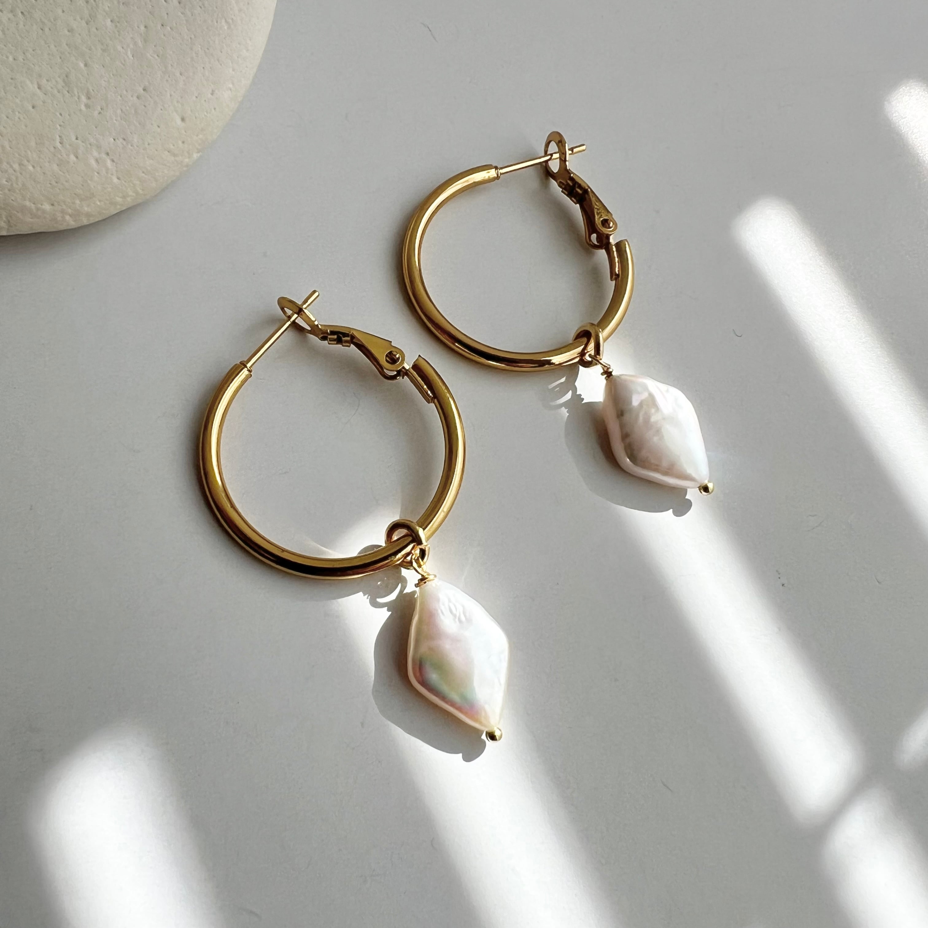 ダイヤ型の淡水パールのフープピアス/イヤリング。