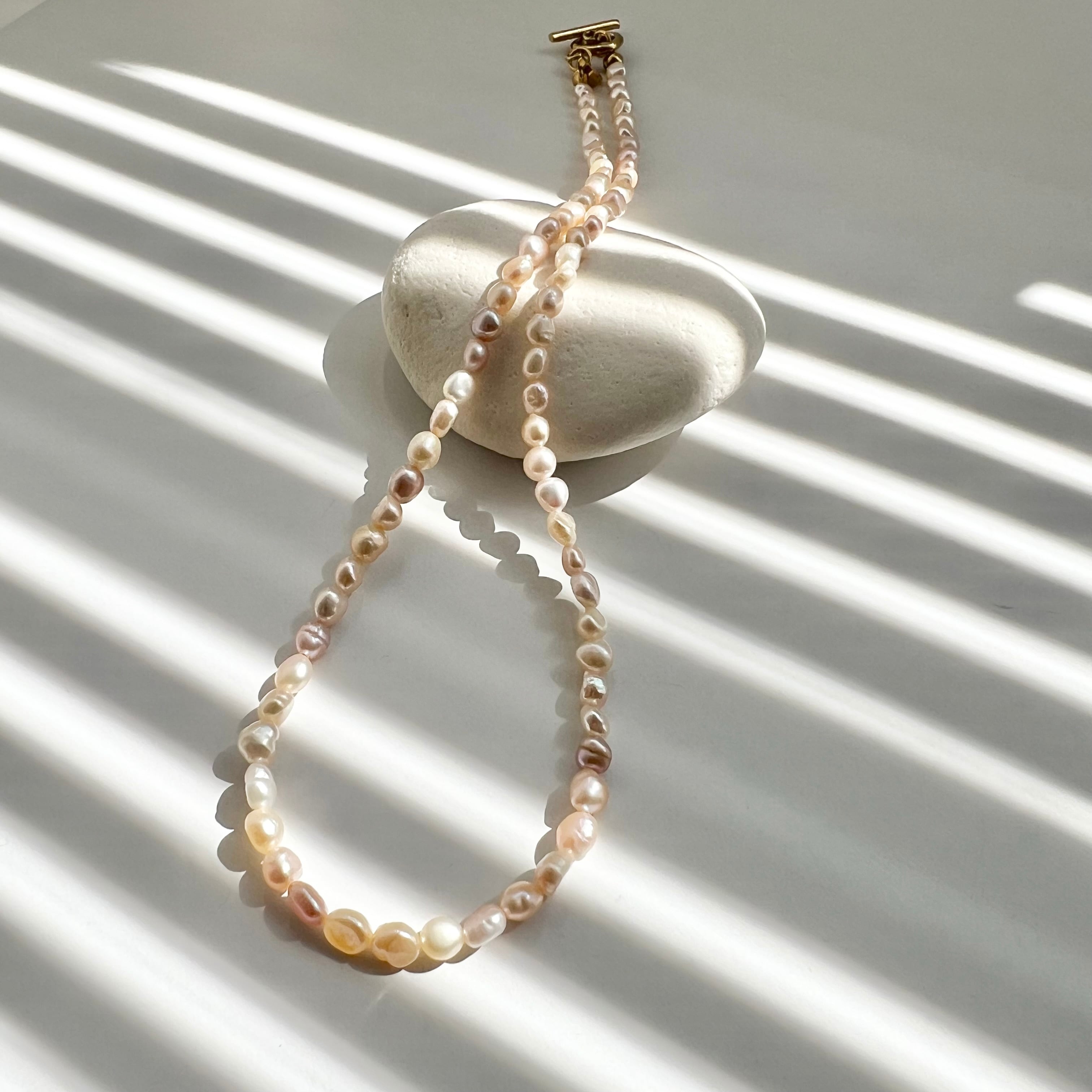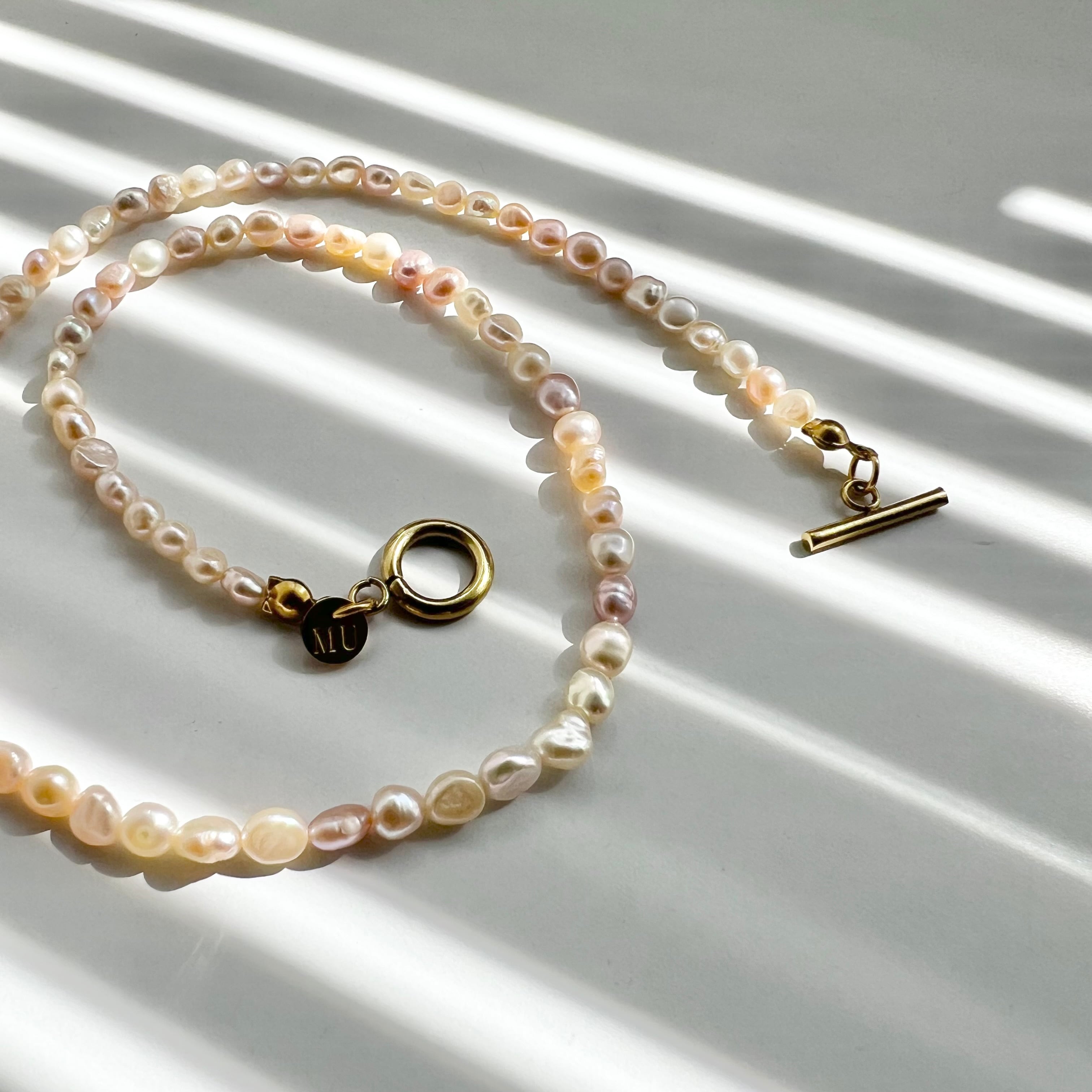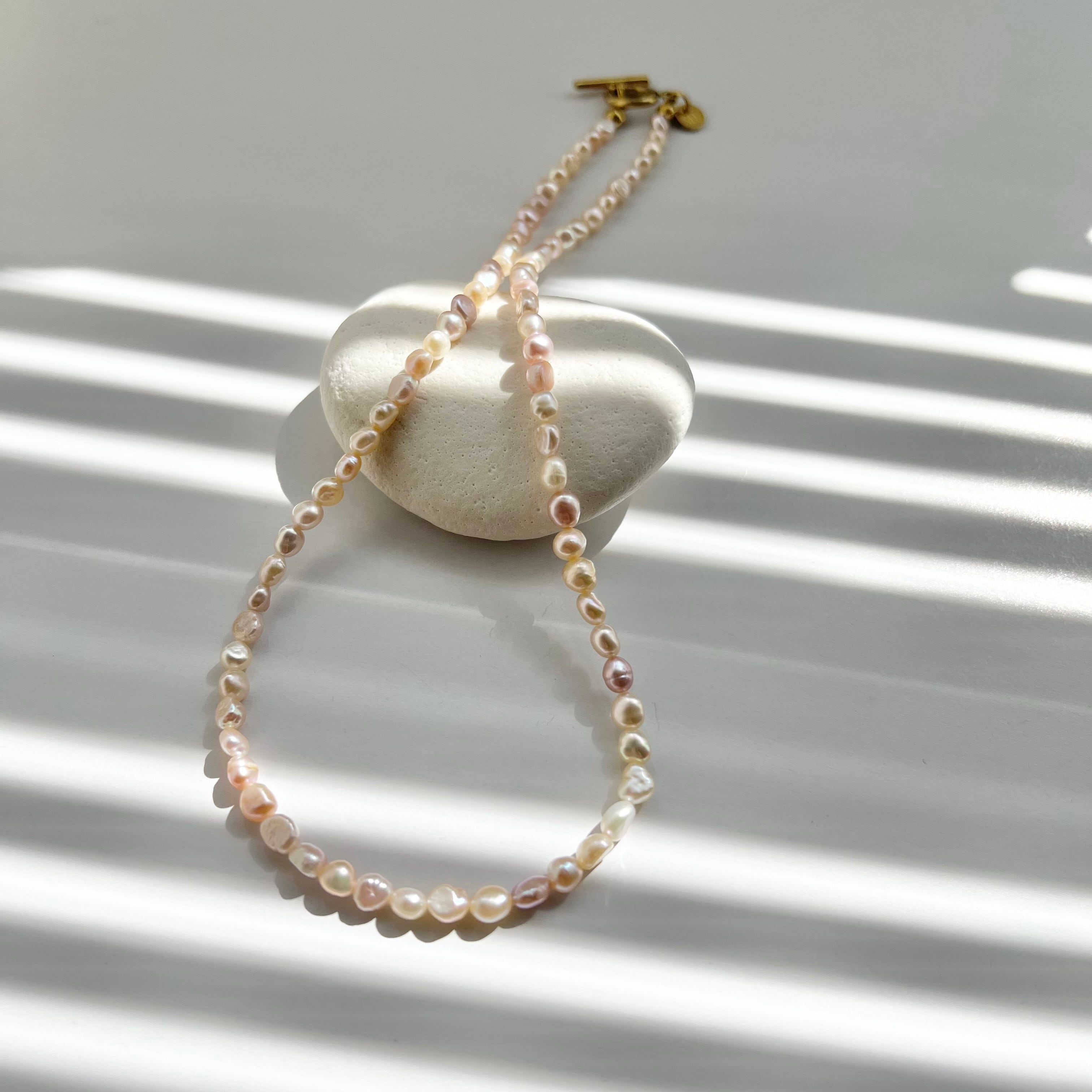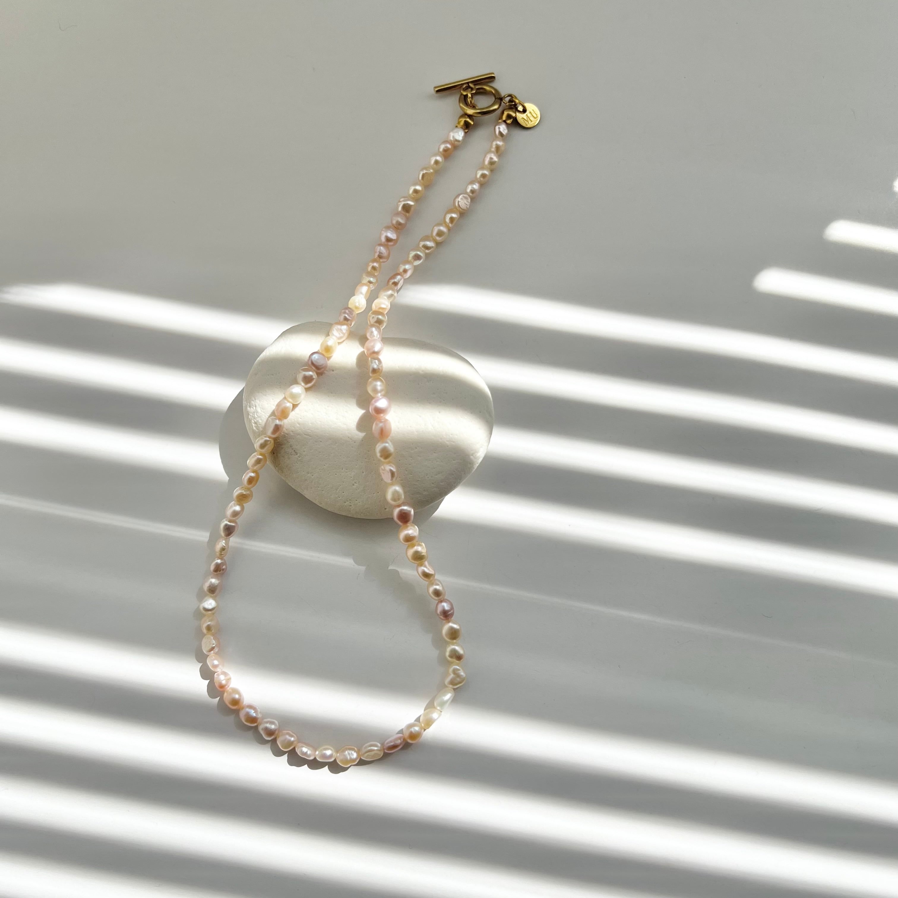 春らしい優しい色合いの淡水パールのショートネックレス。
