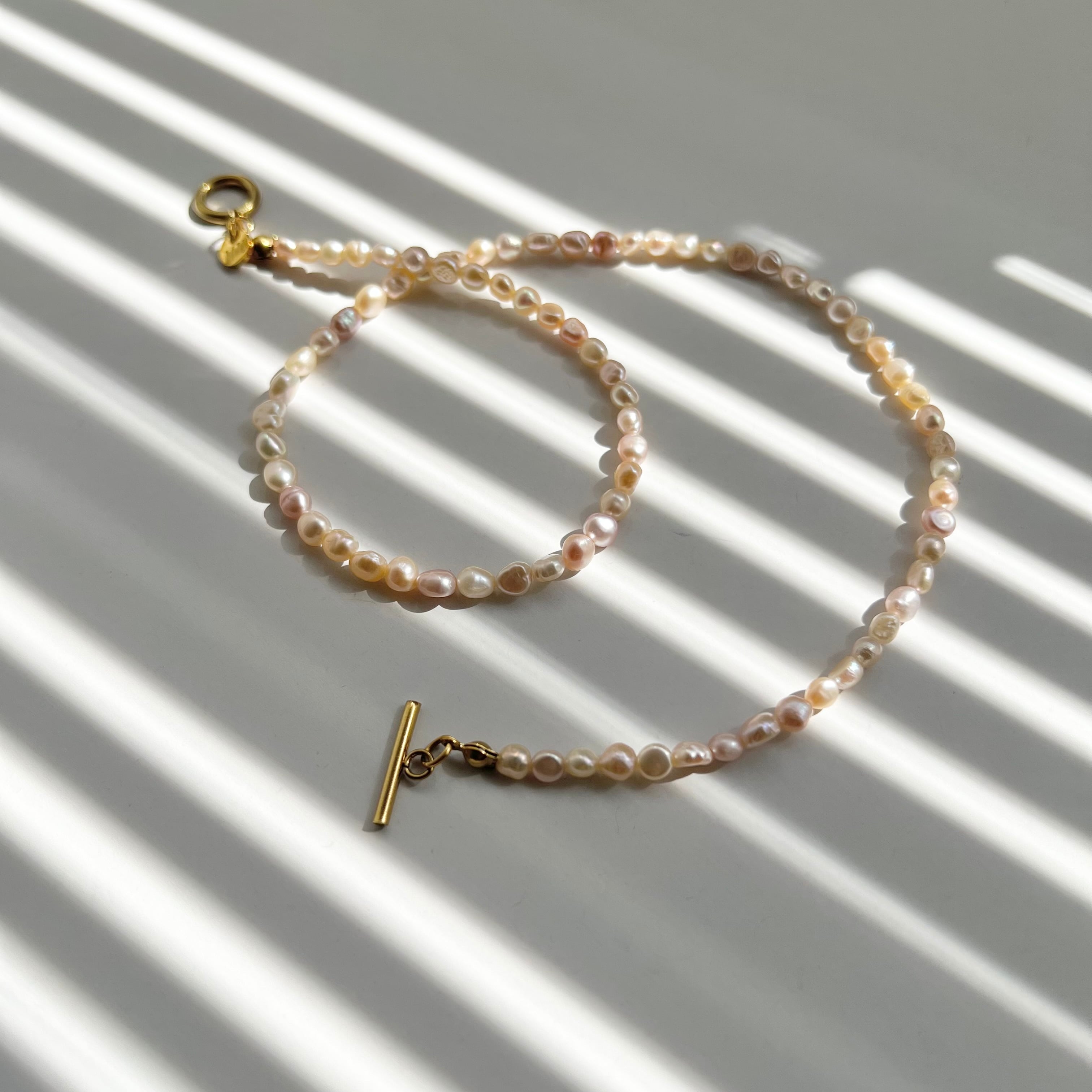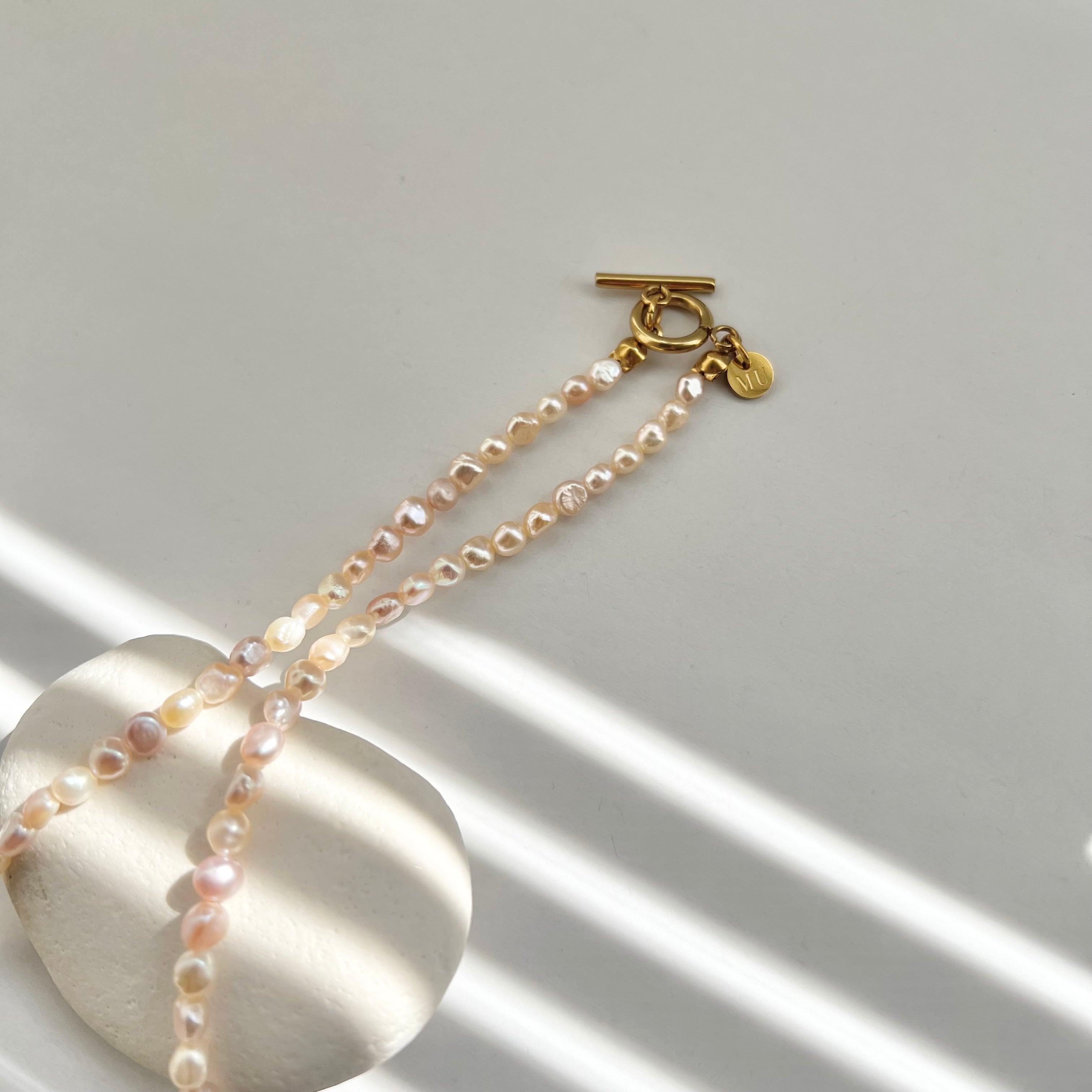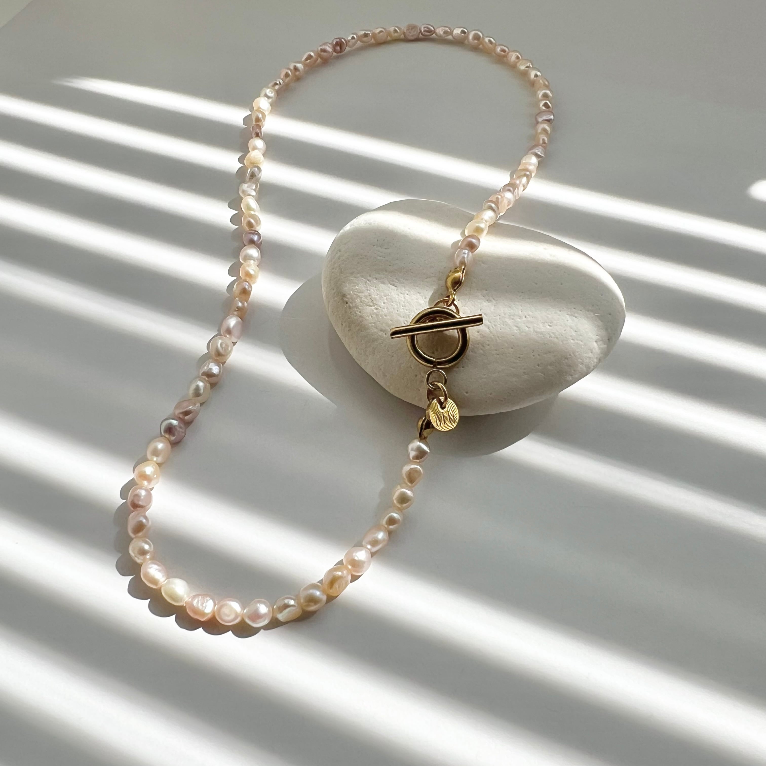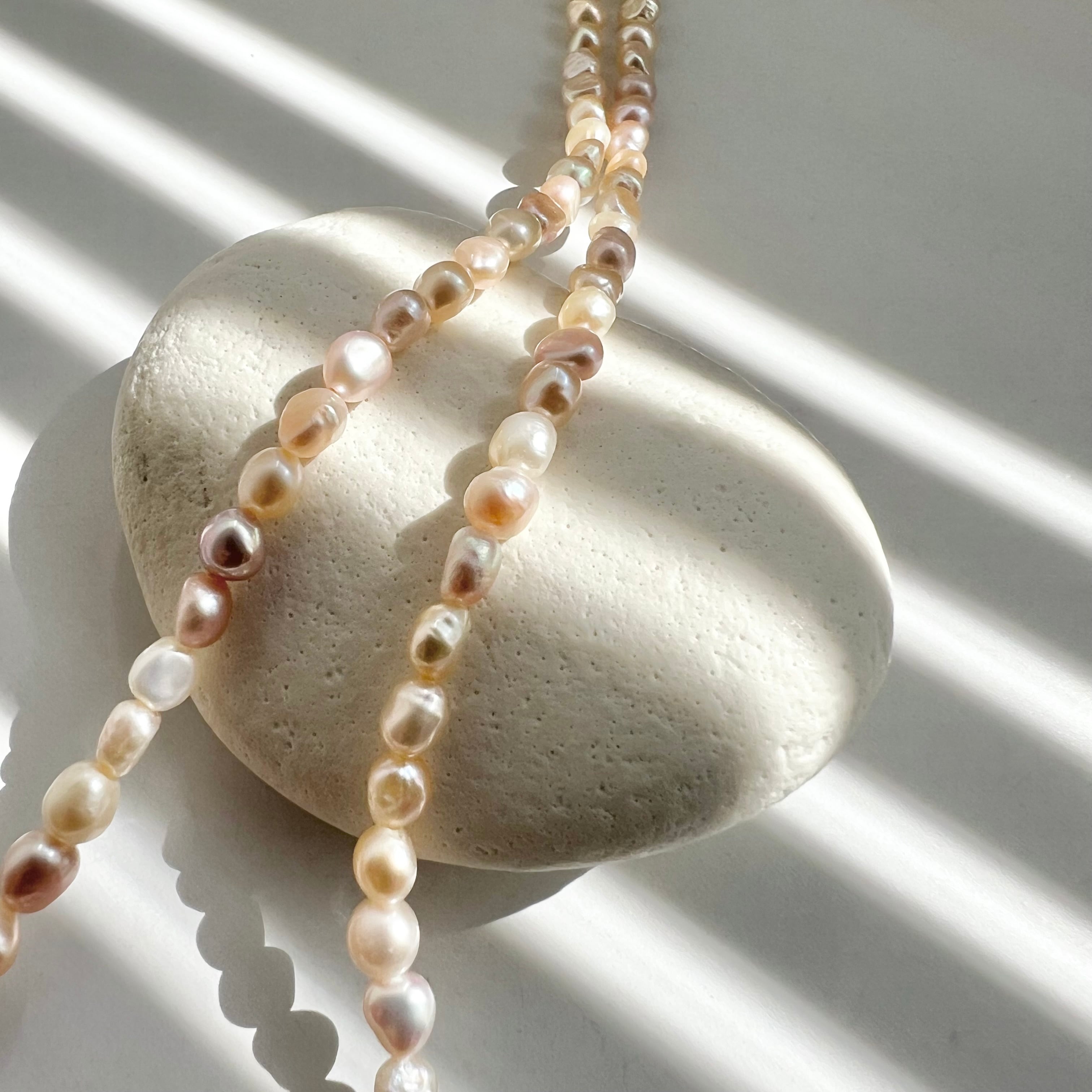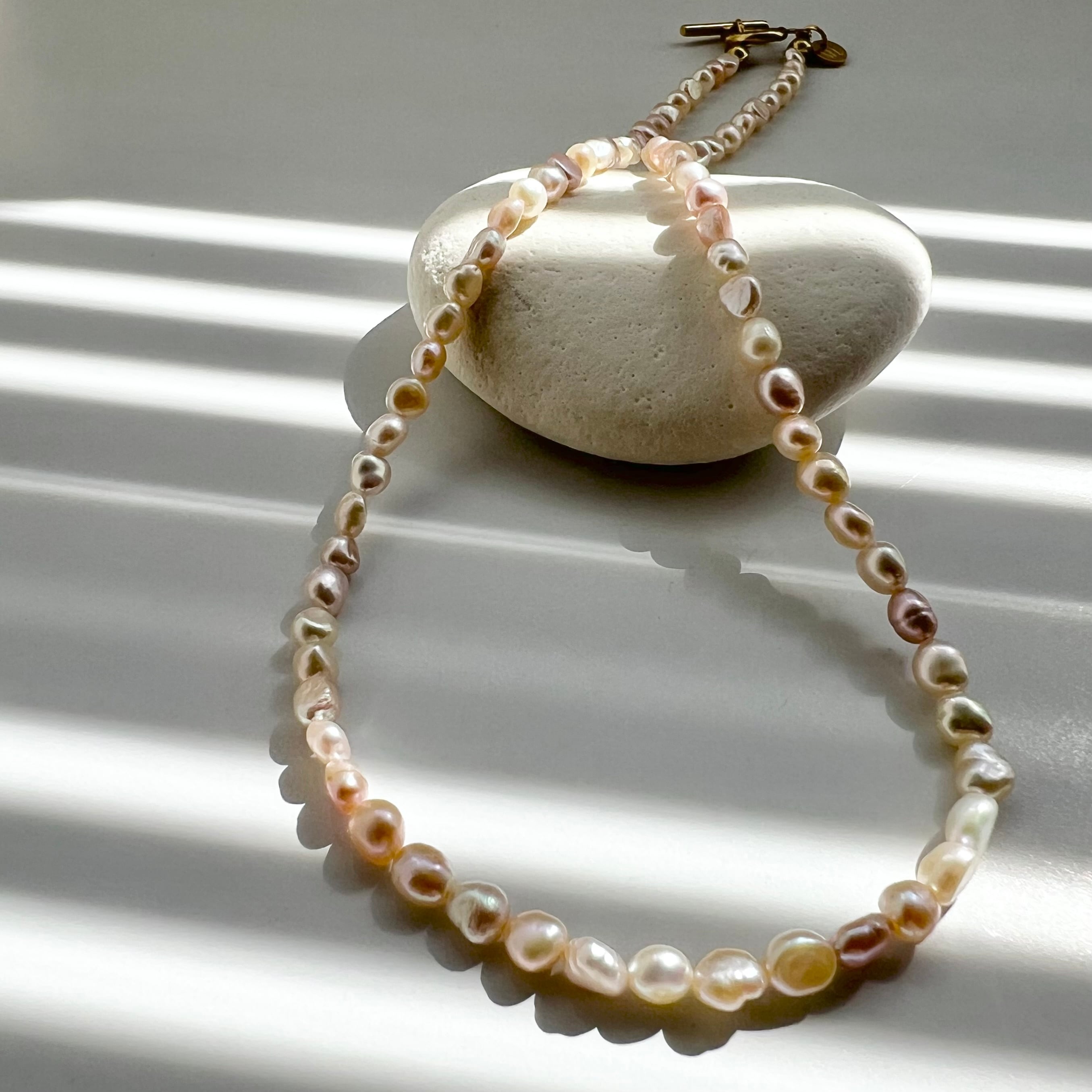 春らしい優しい色合いの淡水パールのショートネックレス。