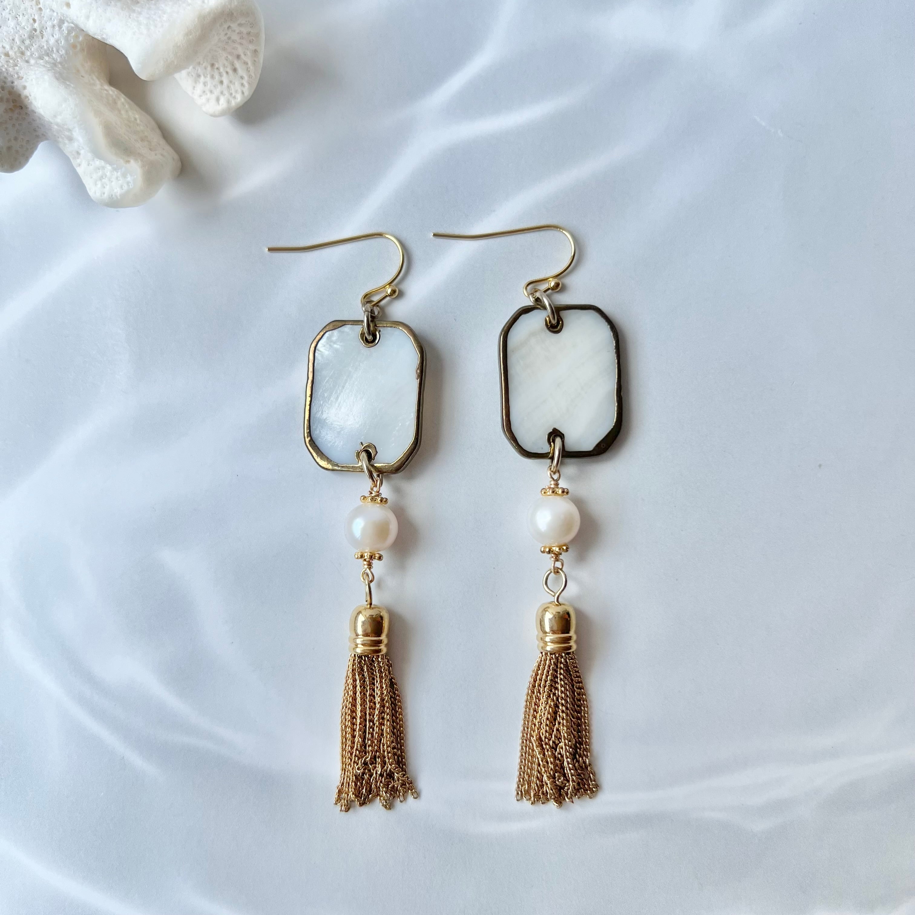 つるっと綺麗な淡水パール、しゃらっと揺れるチェーンタッセルが印象的。