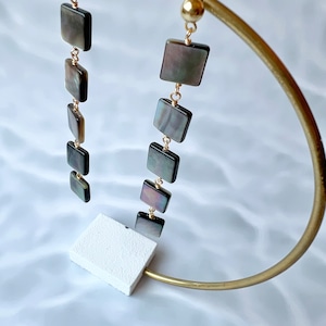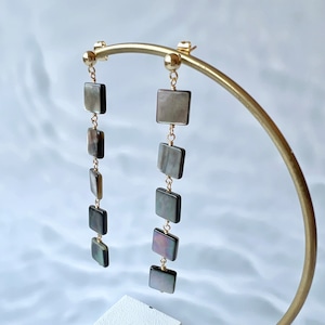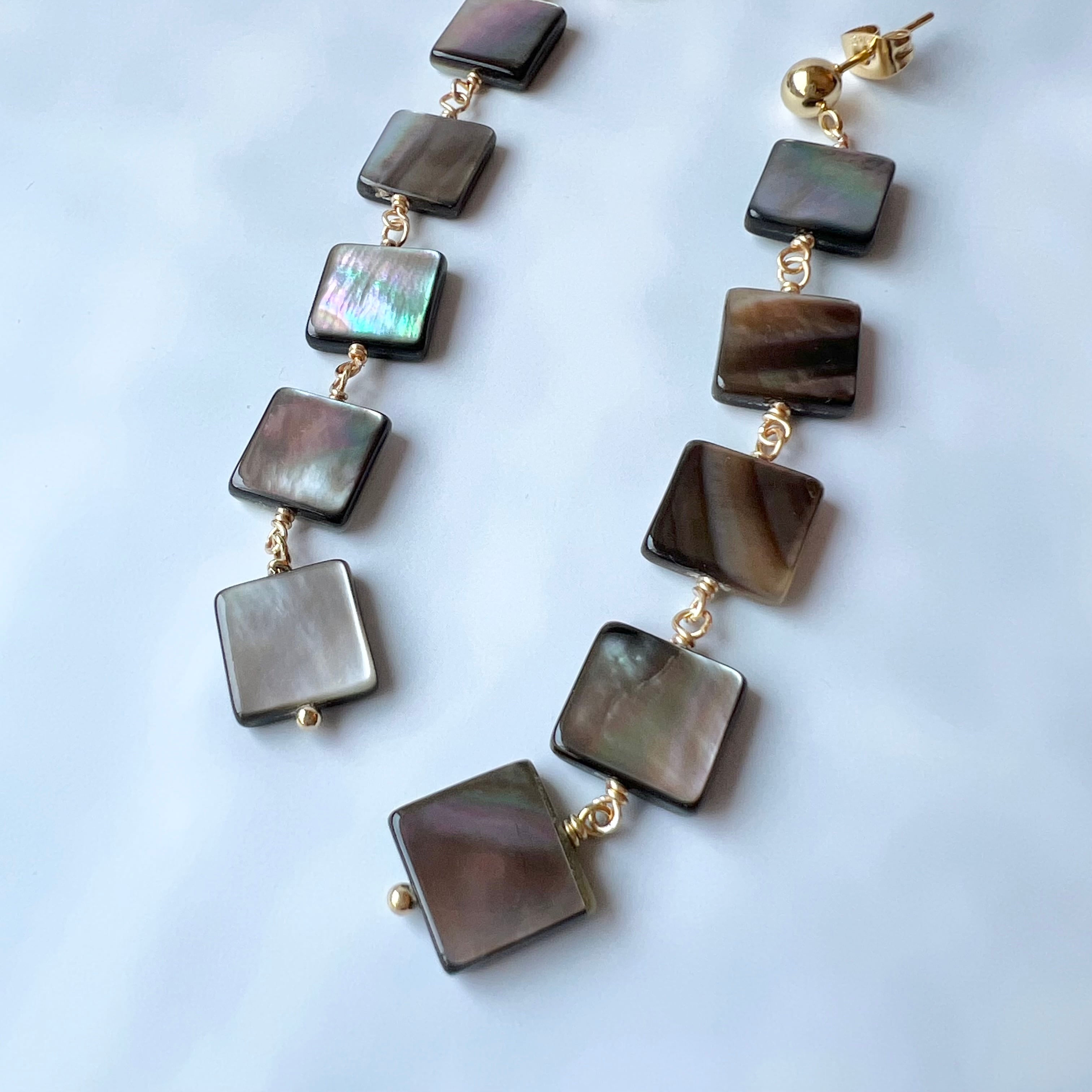 スクエア型の黒蝶貝を連ねたロングピアス。