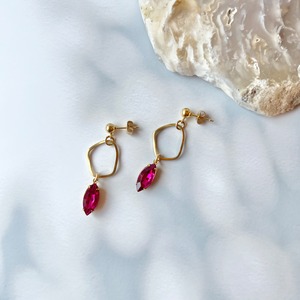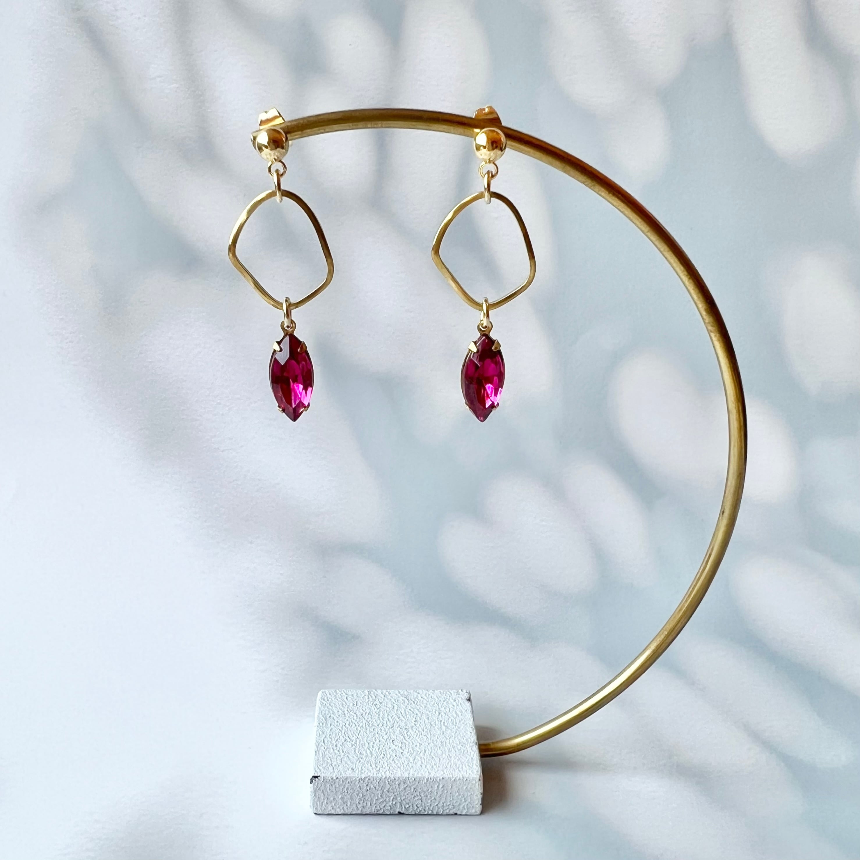 〈ルビーピンク〉ヴィンテージガラス真鍮フープピアス・イヤリング