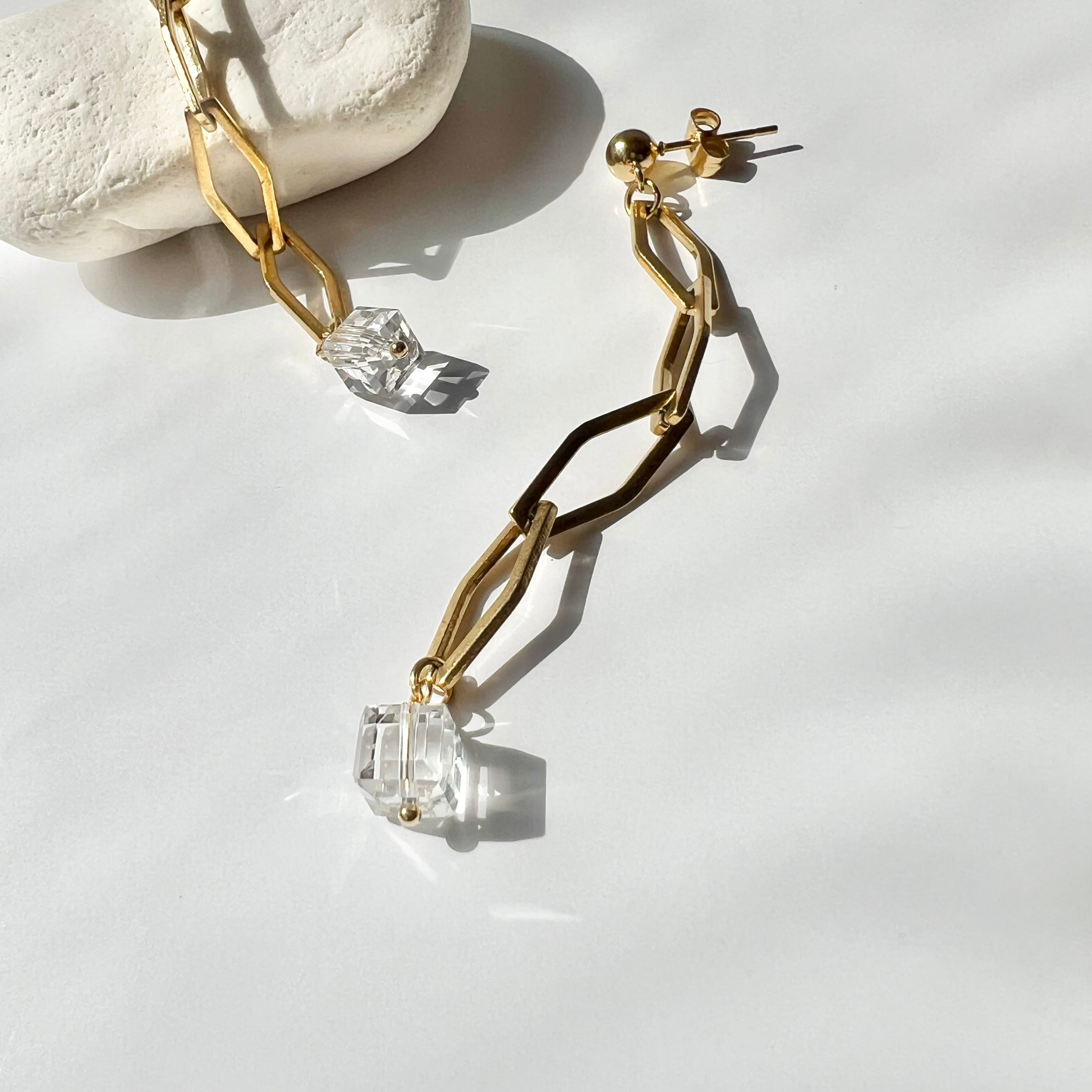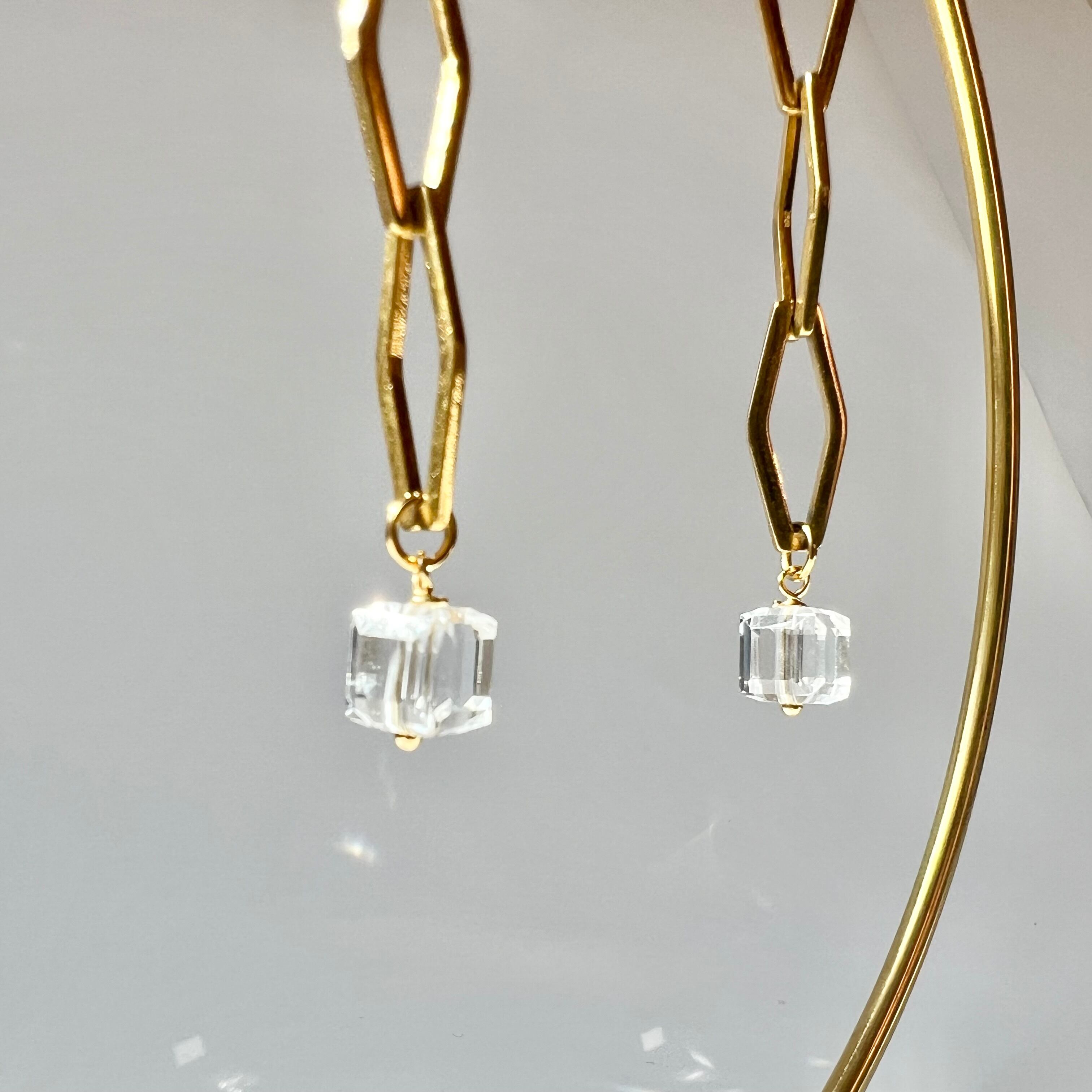 ダイヤ型のチェーンに、キューブ型の水晶が揺れる